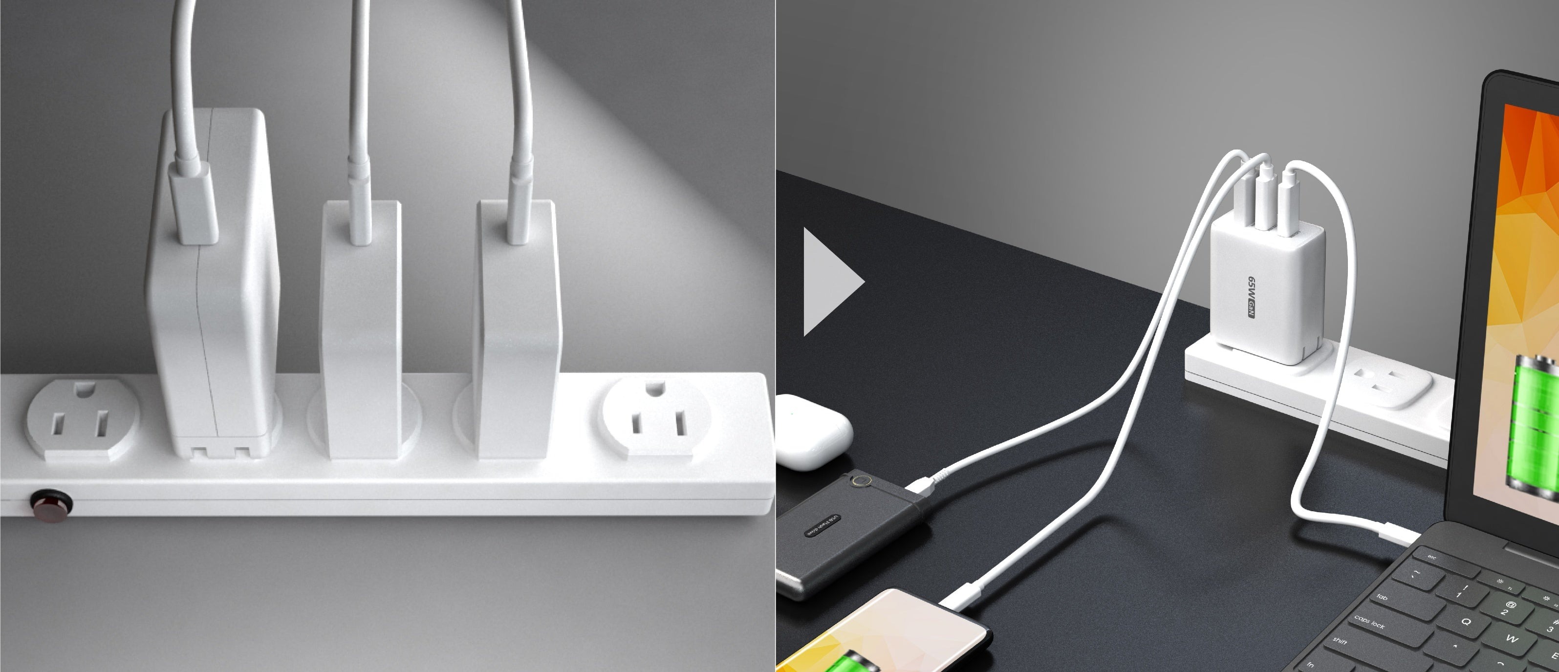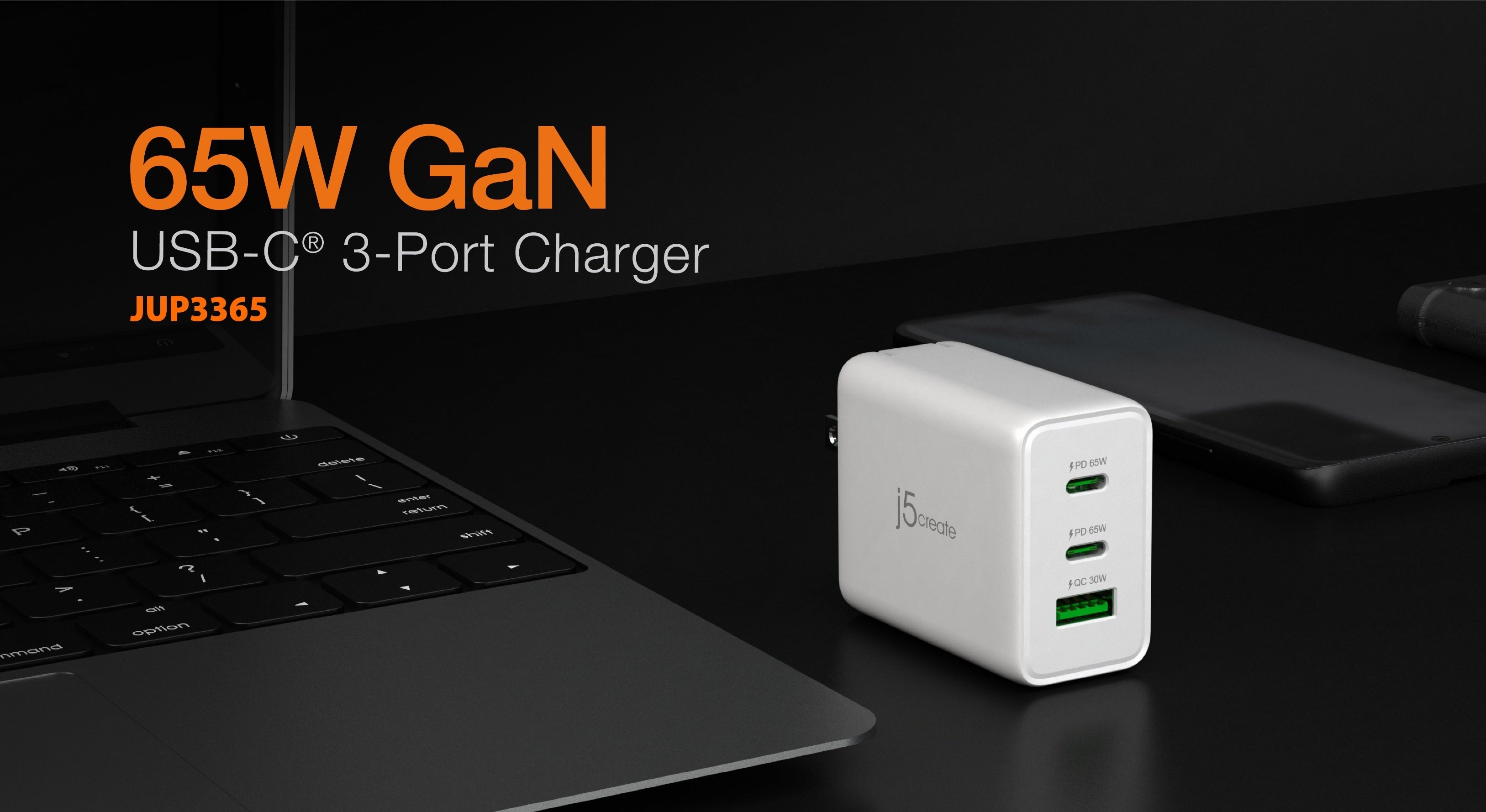 - 1 - 65 Вт GaN USB-C® 3-портовий зарядний пристрій