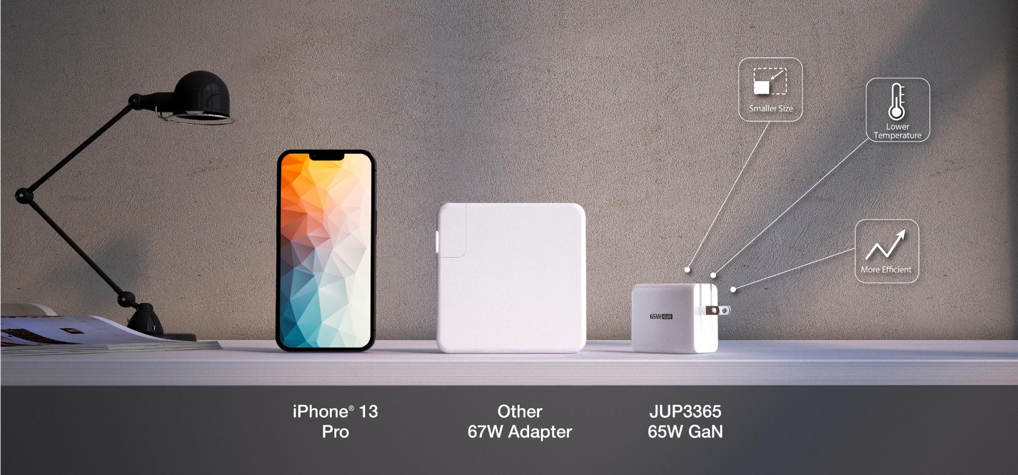 - Розроблений для забезпечення потужності 65 Вт у значно меншому розмірі *Сумарна вихідна потужність 2-портових портів USB-C® для передачі енергії та порту USB™ Type-A