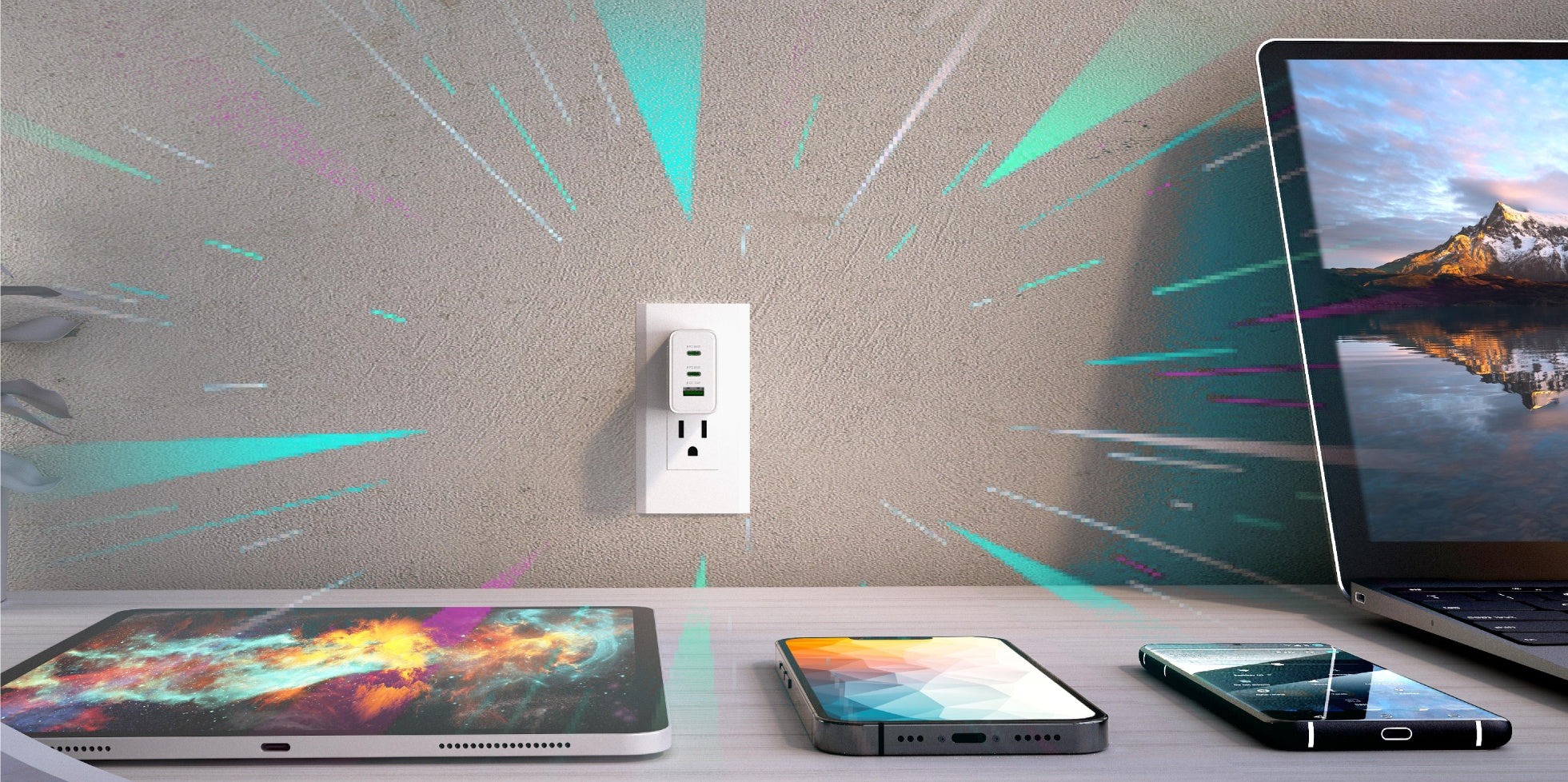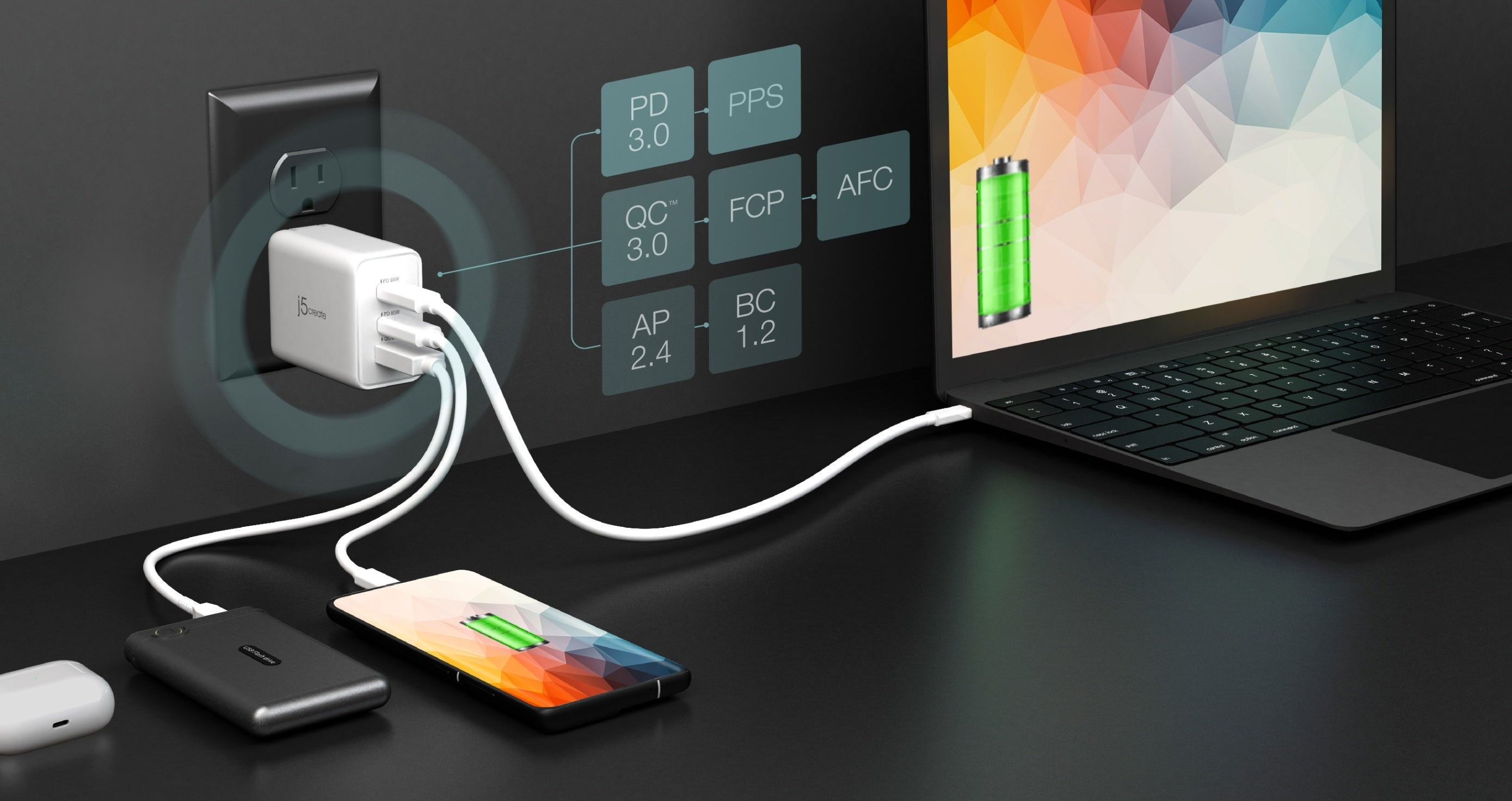 Швидко заряджає MacBook®, Chromebook™, iPad®, iPhone®, AirPods®, Apple Watch® та багато інших пристроїв. Підтримує PD 3.0, PPS, QC™ 3.0, FCP, AFC, AP 2.4 та BC 1.