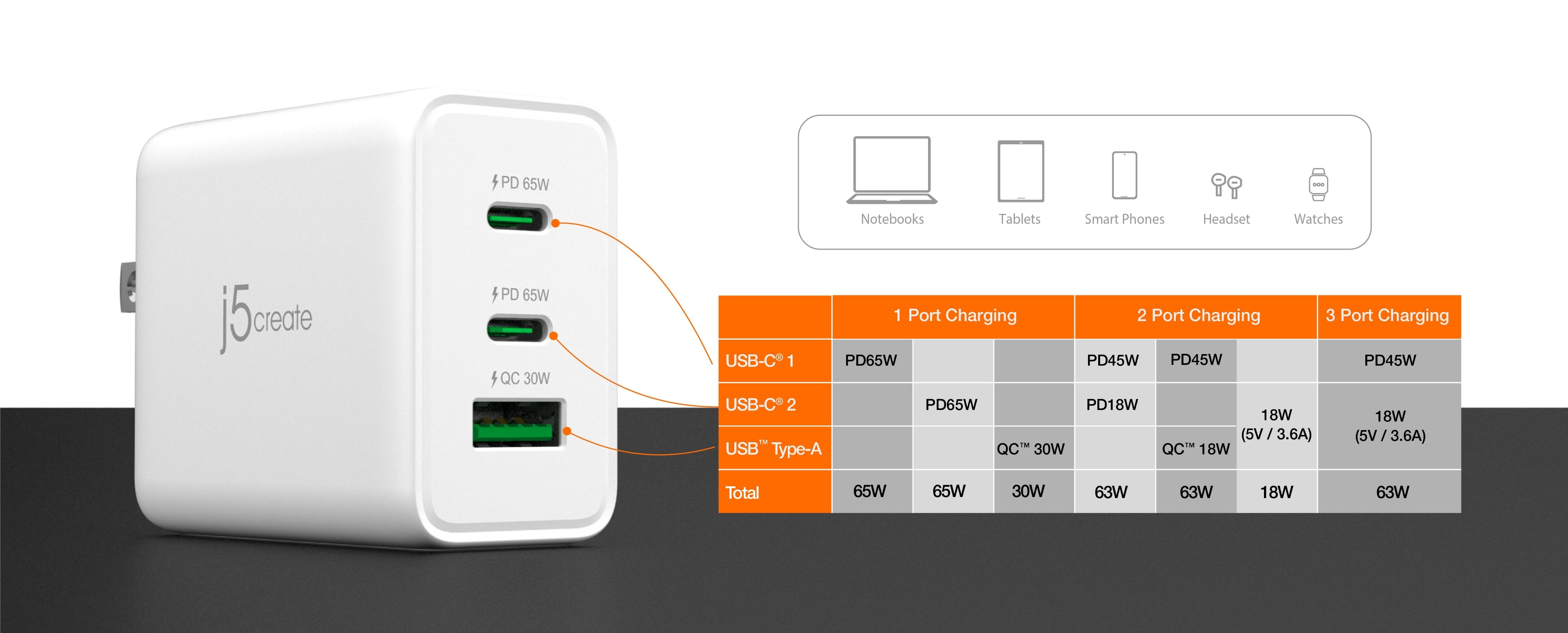 - USB-C® 1, PD45W; USB™ Type-A, QC™ 18W; загалом 63W