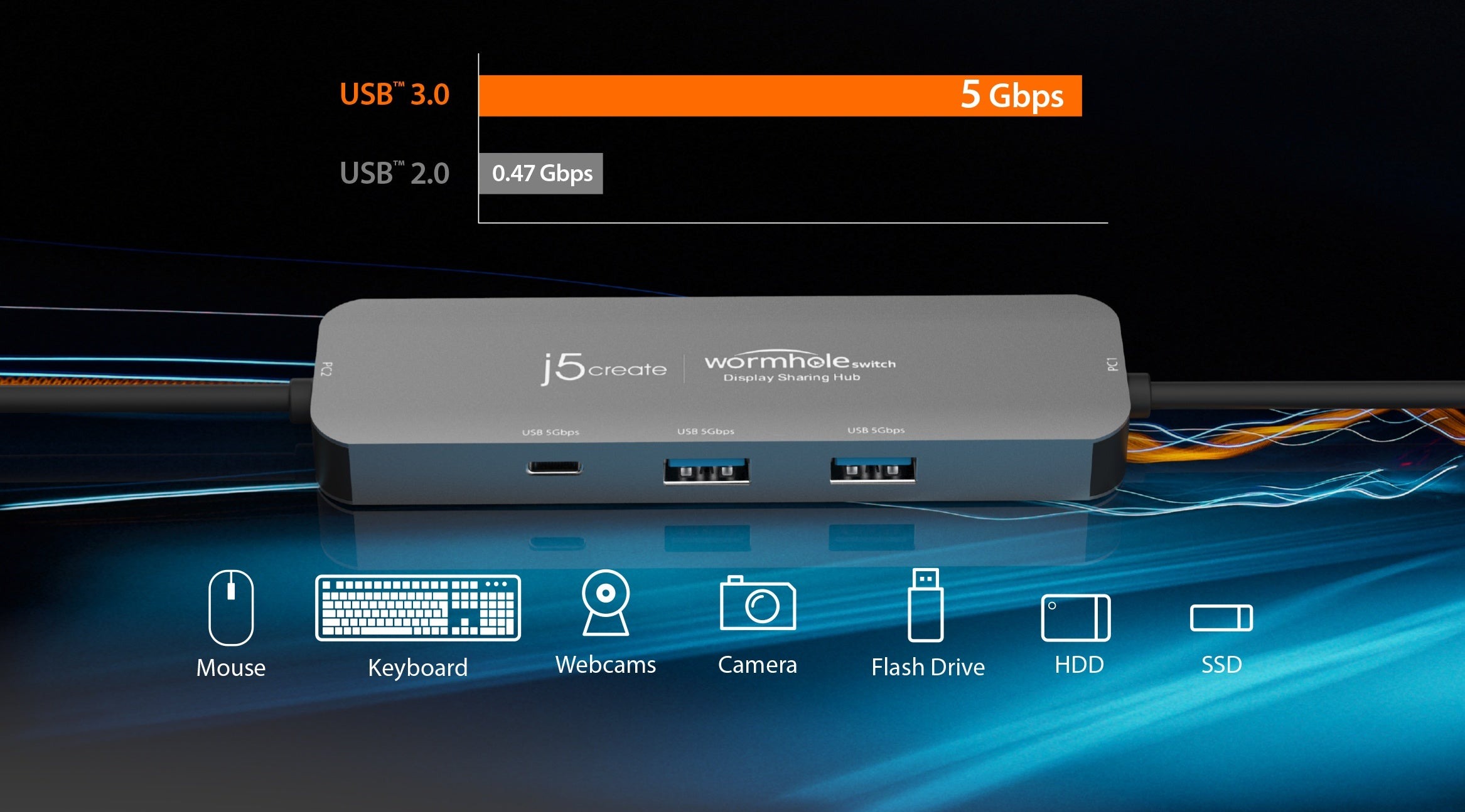 - Два порти USB™ Type-A 5 Гбіт/с та один порт USB-C® 5 Гбіт/с для підключення периферійних пристроїв (працює тільки з хостом PC1)