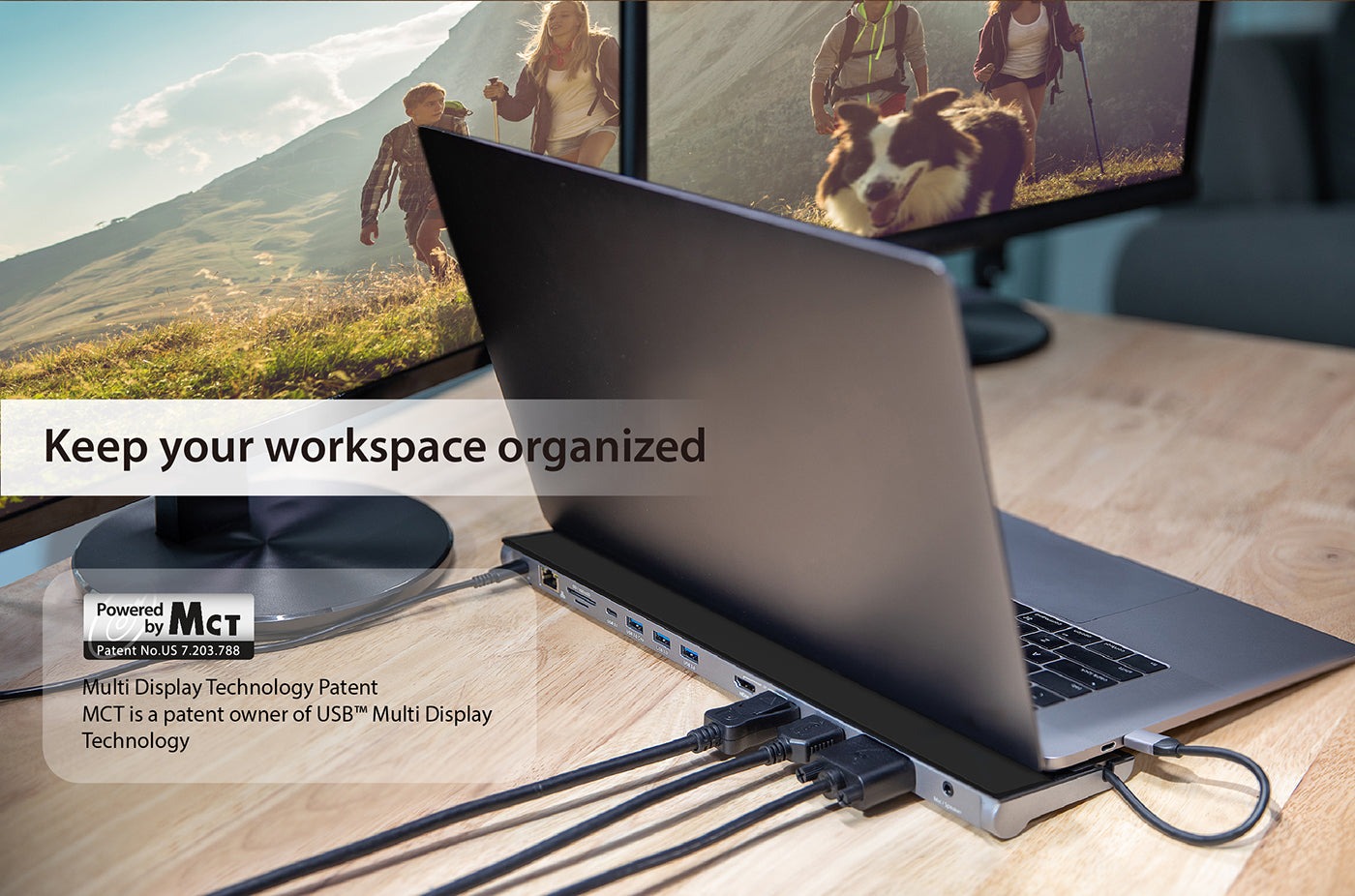 Ця док-станція для трьох дисплеїв перетворює ваш ноутбук Mac® або Windows® на повноцінну робочу станцію з виходом DisplayPort™, двома виходами HDMI™ і виходом VGA, з підтримкою роздільної здатності до 4K (3840 x 2160) на двох дисплеях і 1080p на іншому. Ви також можете використовувати екран ноутбука як четвертий дисплей, що полегшує одночасний доступ до декількох програм. Завдяки 100 Вт Power Delivery, трьом портам USB™ 3.0 і порту USB-C™ док-станція ідеально підходить для MacBook®, Dell® XPS™ або інших ноутбуків USB-C™, які потребують додаткових портів.