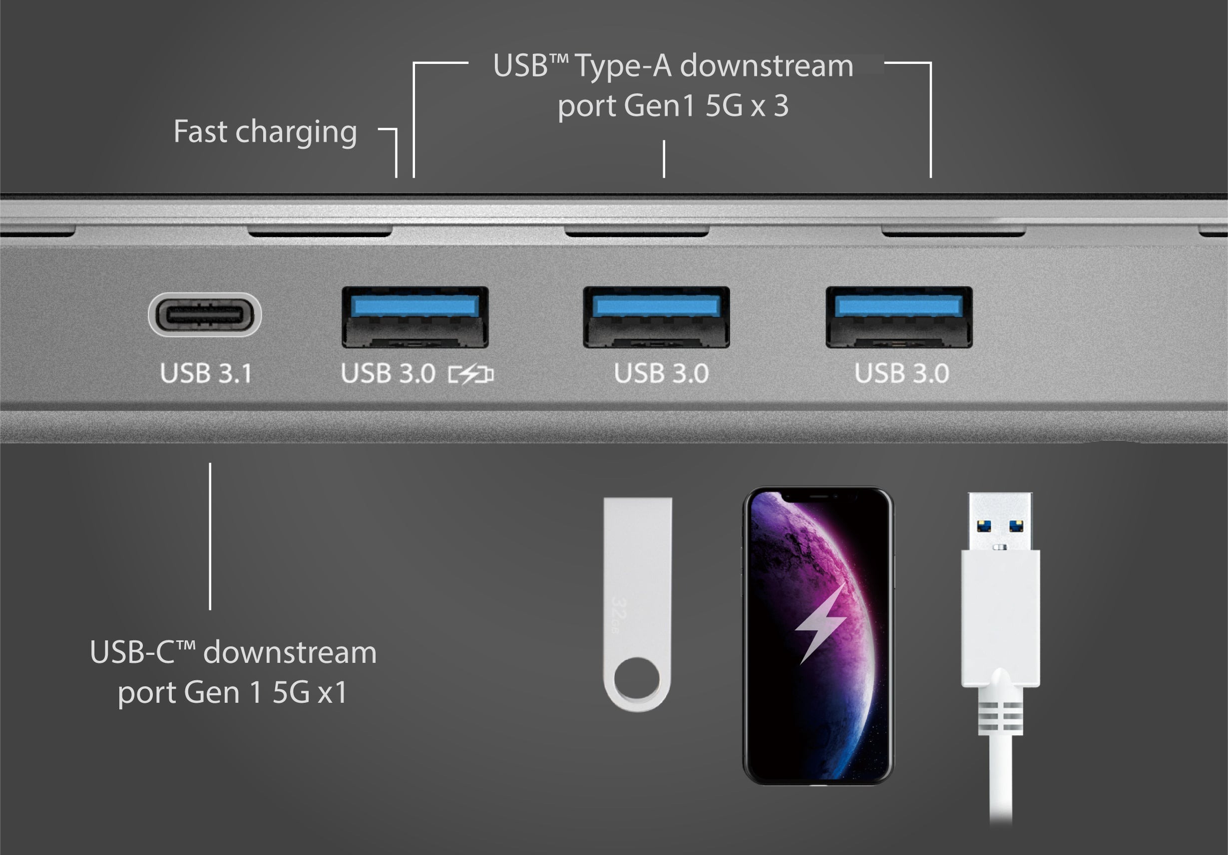 Ця док-станція USB™ 3.0 також оснащена портом RJ45 Gigabit Ethernet, пристроєм для зчитування/запису карт пам'яті та комбінованим аудіороз'ємом для максимальної продуктивності. Піднята конструкція сприяє відведенню тепла, а двосторонній відсік для зберігання кабелів забезпечує легке підключення незалежно від розташування порту USB-C™.