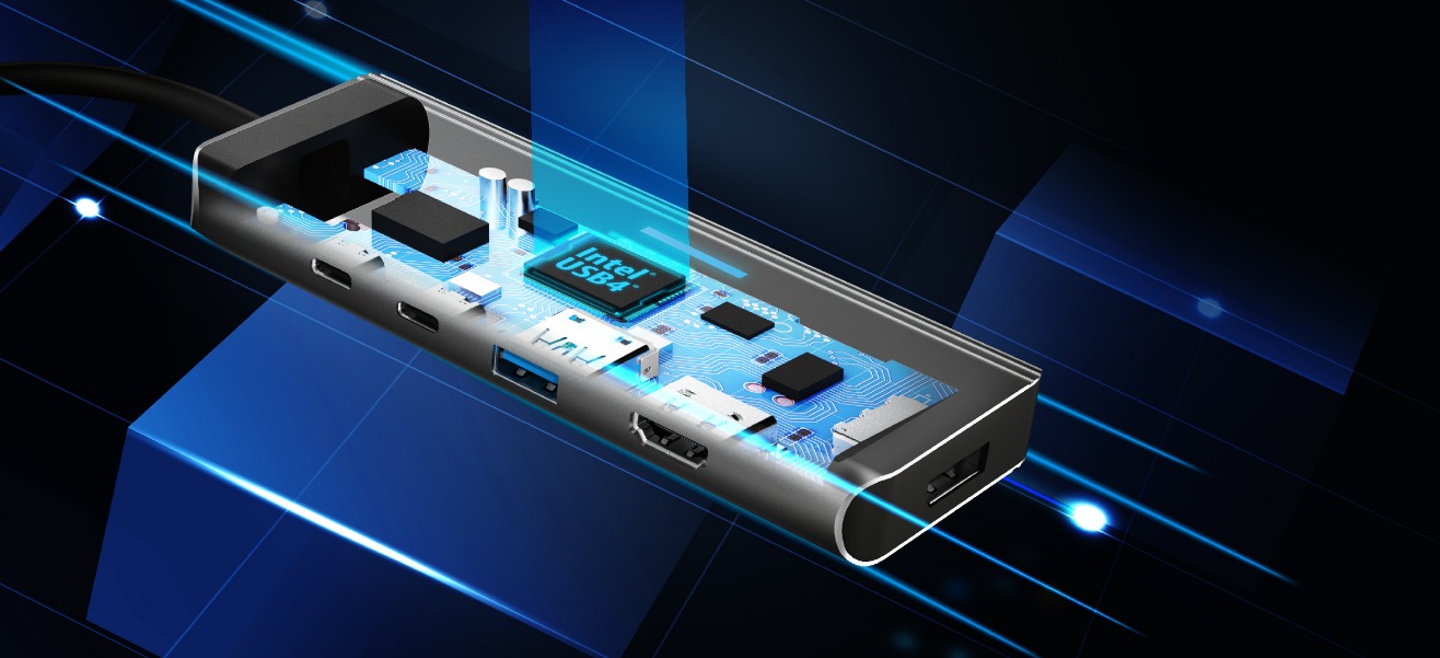 Високопродуктивний багатопортовий концентратор USB4® та перший концентратор USB-C®, що містить найновіший контролер USB4® від Intel®, сумісний із Thunderbolt™ 3 та 4, а також USB4®.
